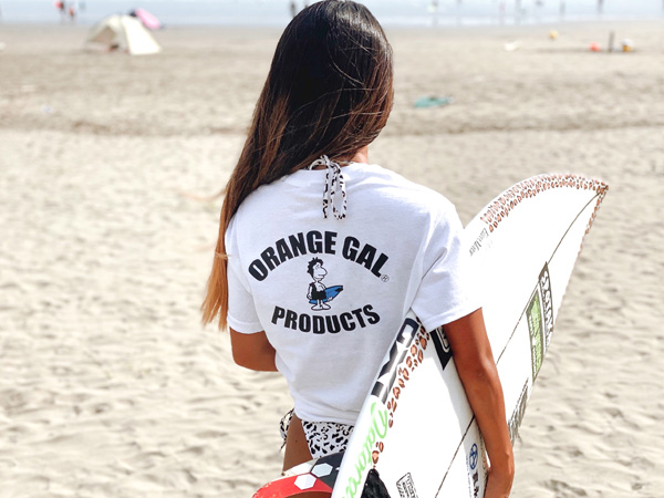 当時のロゴを少しアレンジしたオレンジギャル。Tシャツ、バッグともにユニセックスモデルで、サーファーはじめ、世代を超えて老若男女問うことなく、タウンユースとしてもお使いいただける仕様で復刻いたしました!