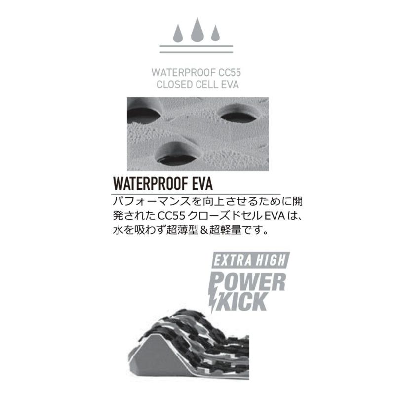 ・WATER PROOF EVA:水を吸わない新素材「CC55クローズドセルEVA」によって、さらなる薄型化と軽量化を実現