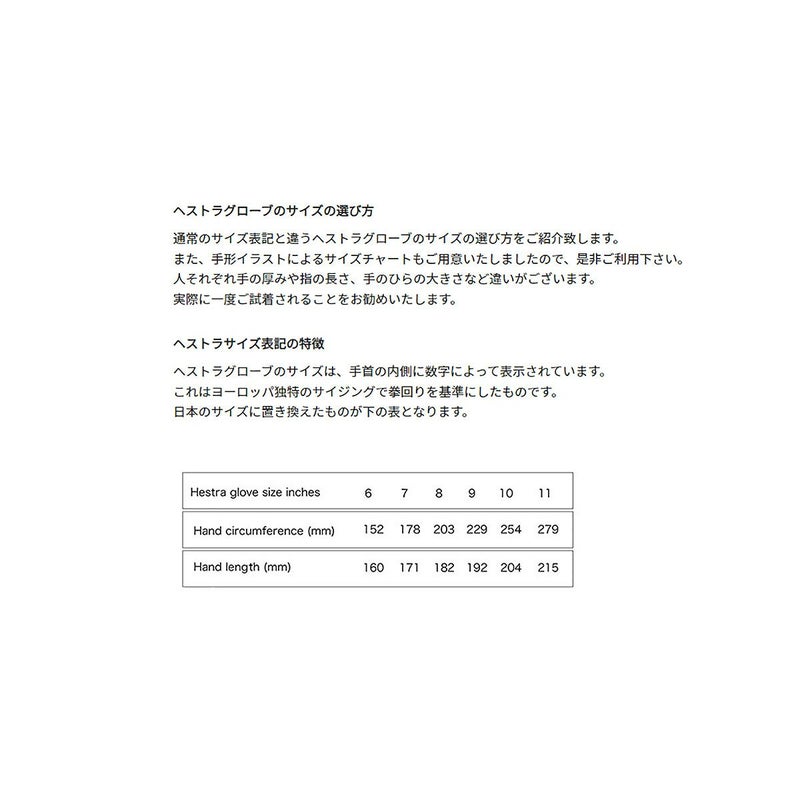 | 素材 | Palm:Goat Leather Back:HESTRA Niak Polyester Insert:C-Zone Insulation:G-Loft polyester Lining:Brushed Polyester Features:Paeacord Adjustments Hand Cuff |