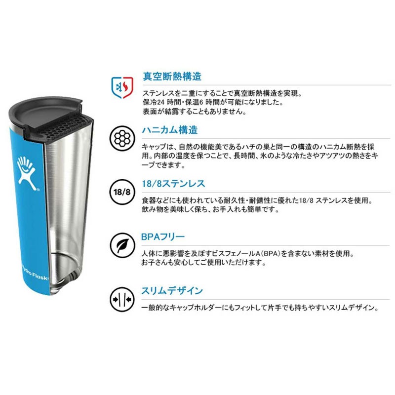 HydroFlaskは温度を保つための二重壁真空断熱技術(TempShield(TM))をすべてのボトル製品に採用。朝、氷水を持って出かければ、午後になってもまだ氷が溶けずに残っていることをお約束します。慌ただしい朝、コーヒーを飲む時間がないと思っていませんか? ご心配なく。HydroFlaskなら身支度が整うまでコーヒーを熱いままに保てます。また、冷たい飲み物でボトルの外側に結露したり、熱い飲み物でボトルが持てないなんて事は無いような仕様です。