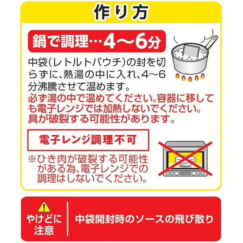 | 素材 | 鶏肉(国産)、豚コラーゲンペプチド、牛脂豚脂混合油、トマトペースト、砂糖、カレーパウダー、小麦粉、でんぷん、香辛料、チャツネ、りんご濃縮果汁、ウスターソース、ガーリックペースト、しょうがペースト、食塩、酵母エキス、バナナペースト、りんご酢、チーズパウダー、オニオンパウダー、ガーリックパウダー/調味料(アミノ酸)、酸味料、カラメル色素、香料、香辛料抽出物、(一部に乳成分・小麦・大豆・鶏肉・バナナ・りんご・ゼラチンを含む) |
