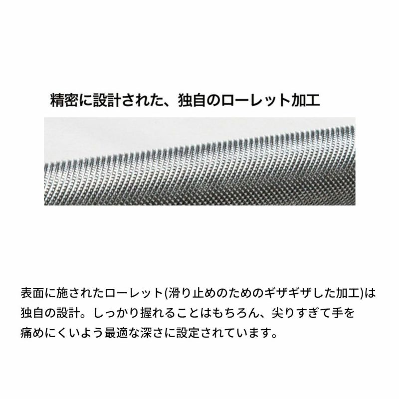 表面に施されたローレット(滑り止めのためのギザギザした加工)は独自の設計。しっかり握れることはもちろん、尖りすぎて手を痛めにくいよう最適な深さに設定されています。