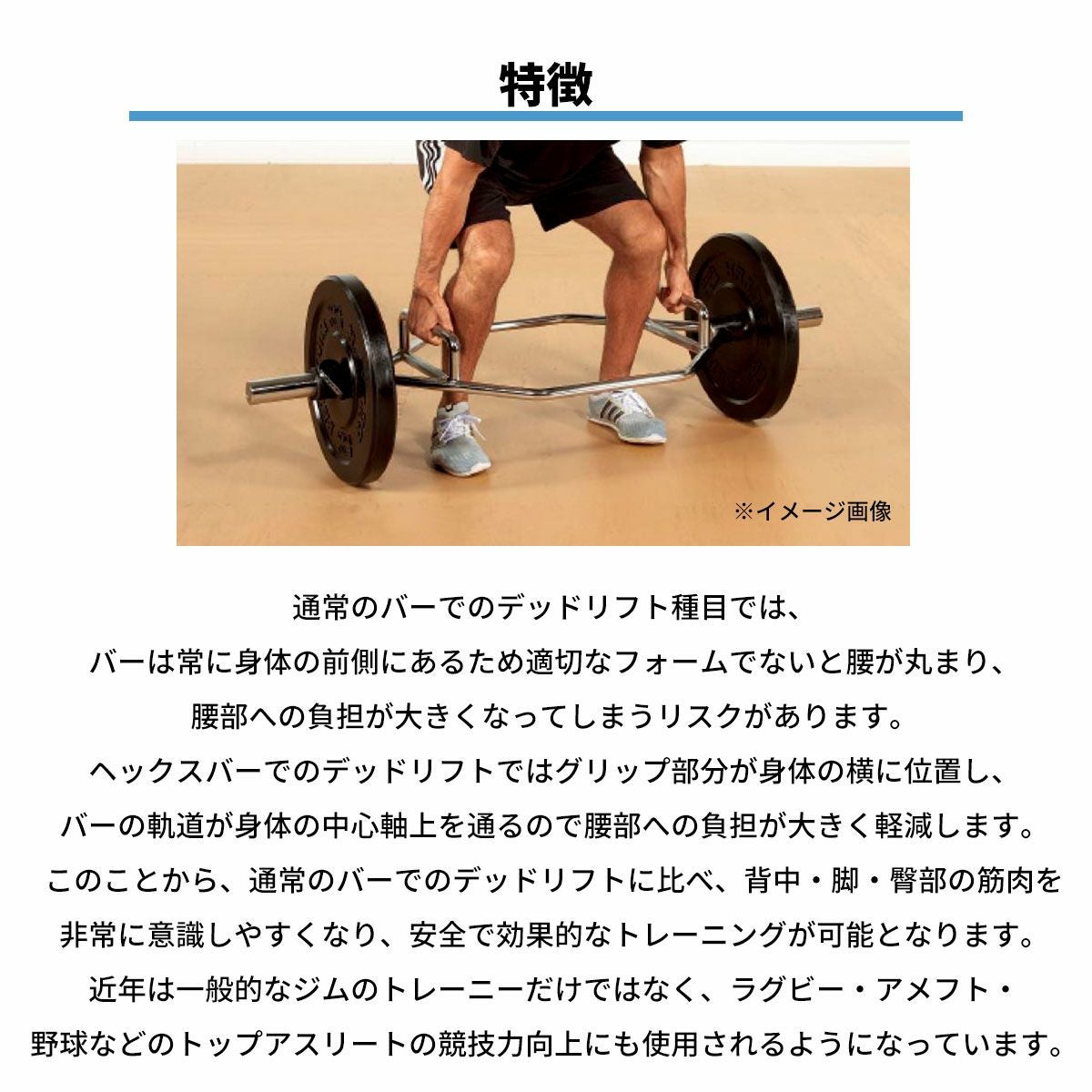 ヘックスバーとは六角の形状のバーであり、デッドリフト等の背中・脚・臀部の筋群に特に効果的なトレーニングが可能となるバーです。