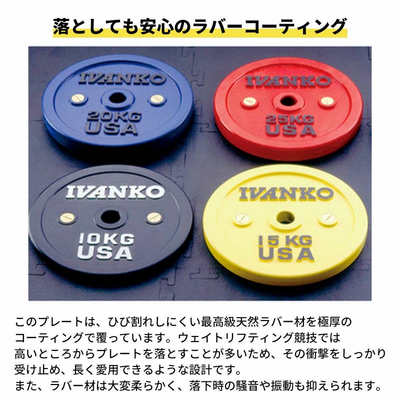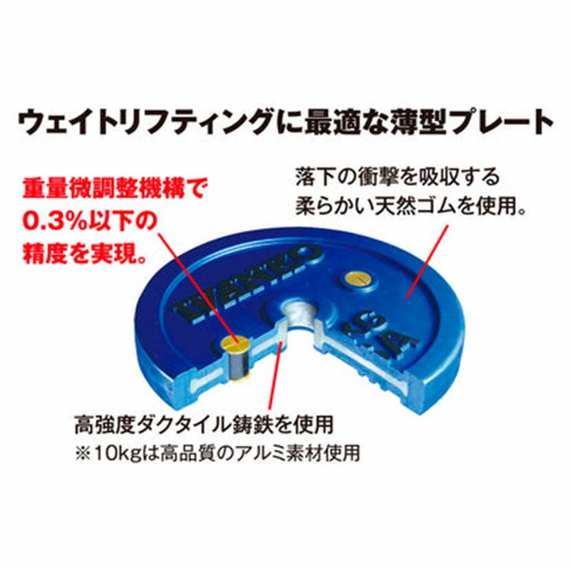 このプレートは、ひび割れしにくい最高級天然ラバー材を極厚のコーティングで覆っています。ウェイトリフティング競技では、高いところからプレートを落とすことが多いため、その衝撃をしっかり受け止め、長く愛用できるような設計です。また、ラバー材は大変柔らかく、落下時の騒音や振動も抑えられます。