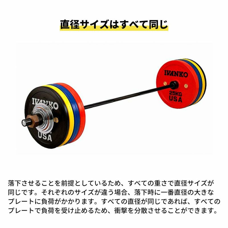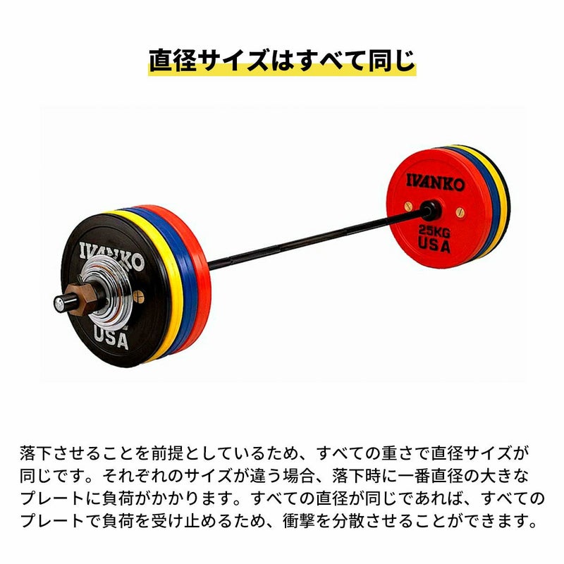 落下させることを前提としているため、すべての重さで直径サイズが同じです。それぞれのサイズが違う場合、落下させた時には一番直径の大きなプレートに負荷がかかります。すべての直径が同じであれば、すべてのプレートで負荷を受け止めるため、衝撃を分散させることができます。