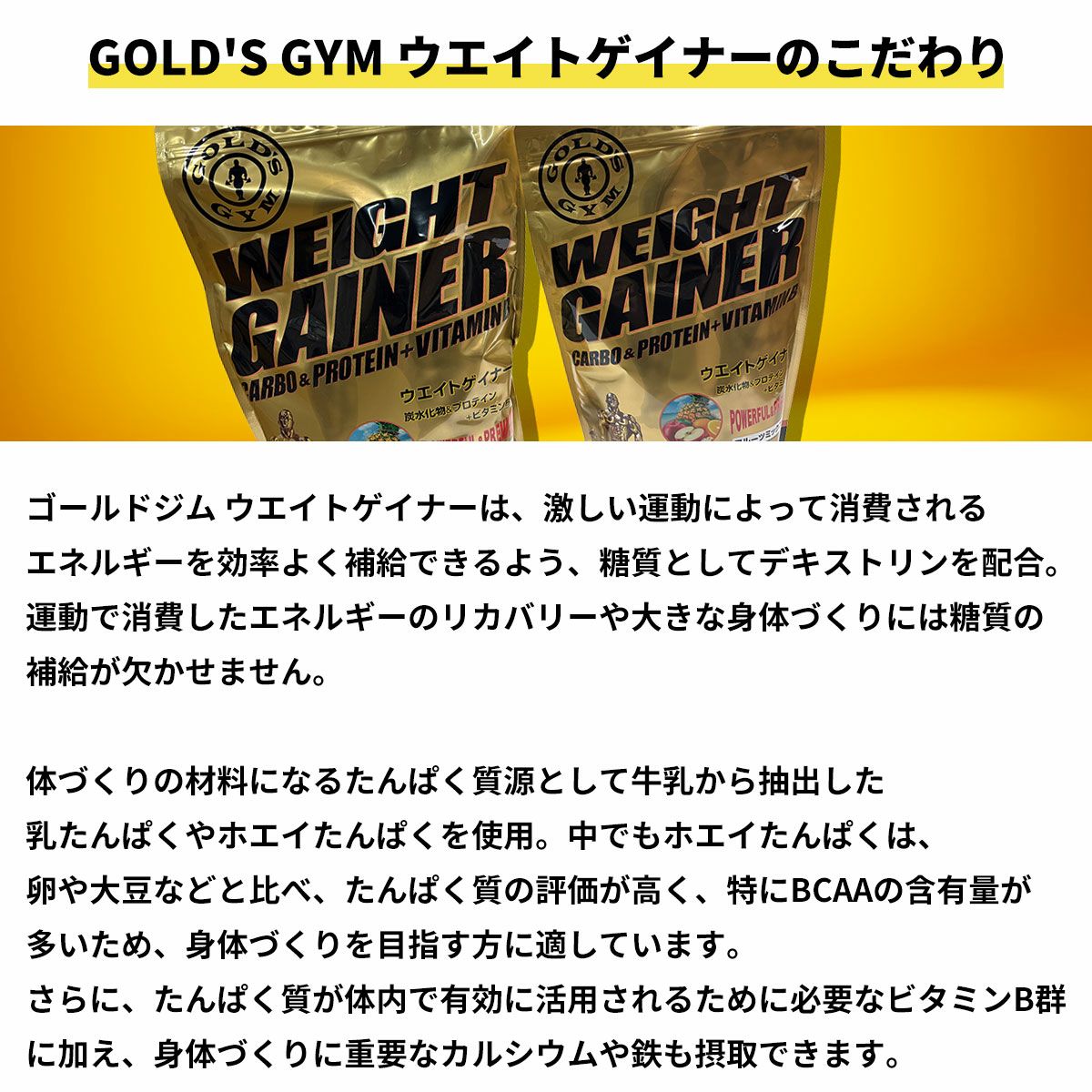 他の画像を見る \送料無料/ ゴールドジム GOLD'S GYM ウエイトゲイナー プロテイン 健康食品 たんぱく質 体重増量 体重アップ ウエイトアップ エネルギー補給 BCAA ビタミンB カルシウム 鉄 900g 2kg 2000g 014 ¥ 4,104 税込 〜 ¥ 税込 詳細を見る お気に入りに登録する