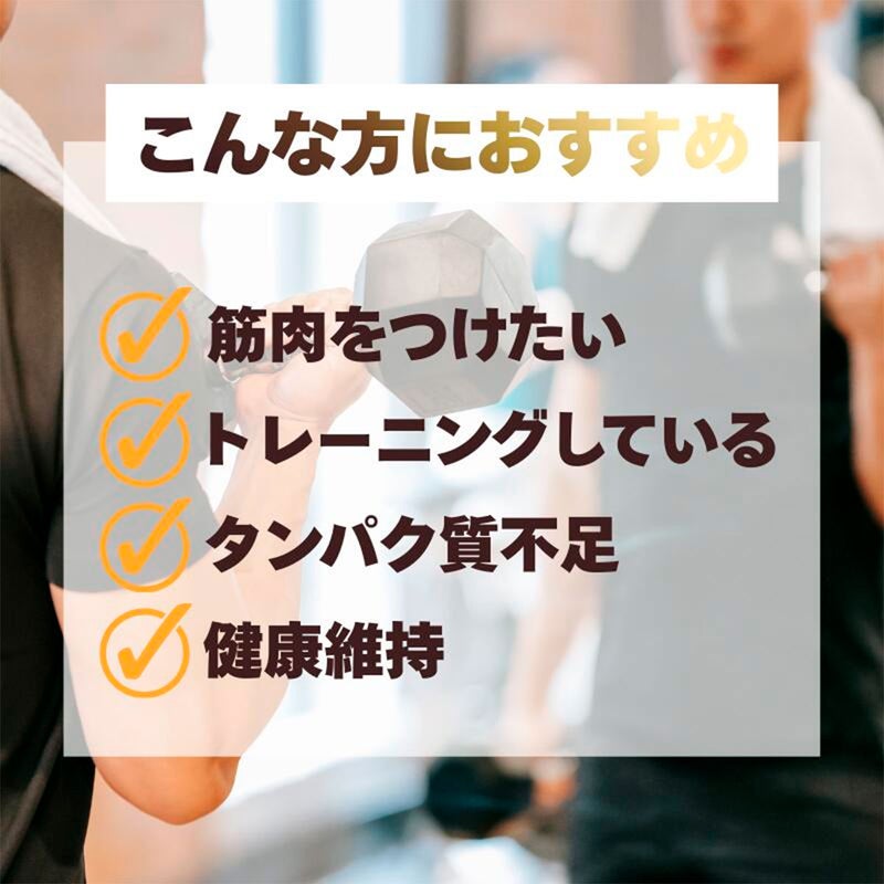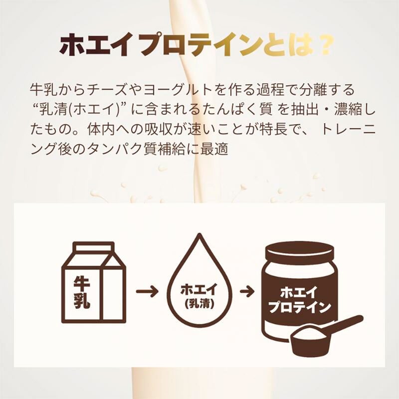 ホエイたんぱくは体内では作られないEAA(必須アミノ酸)、特にBCAAを豊富に含み、他のたんぱく質と比べ吸収が良いという特長を持つ事からウエイトトレーニングやスポーツを行う方に特におすすめです。他にも食事で不足しがちなたんぱく質の補給やダイエット時、間食に適しています。