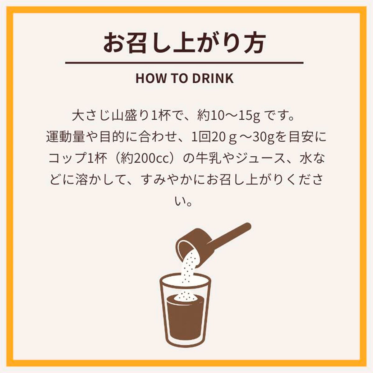大さじ山盛り1杯で、約10~15g です。運動量や目的に合わせ、1回20g~30gを目安にコップ1杯(約200cc)の牛乳やジュース、水などに溶かして、すみやかにお召し上がりください。