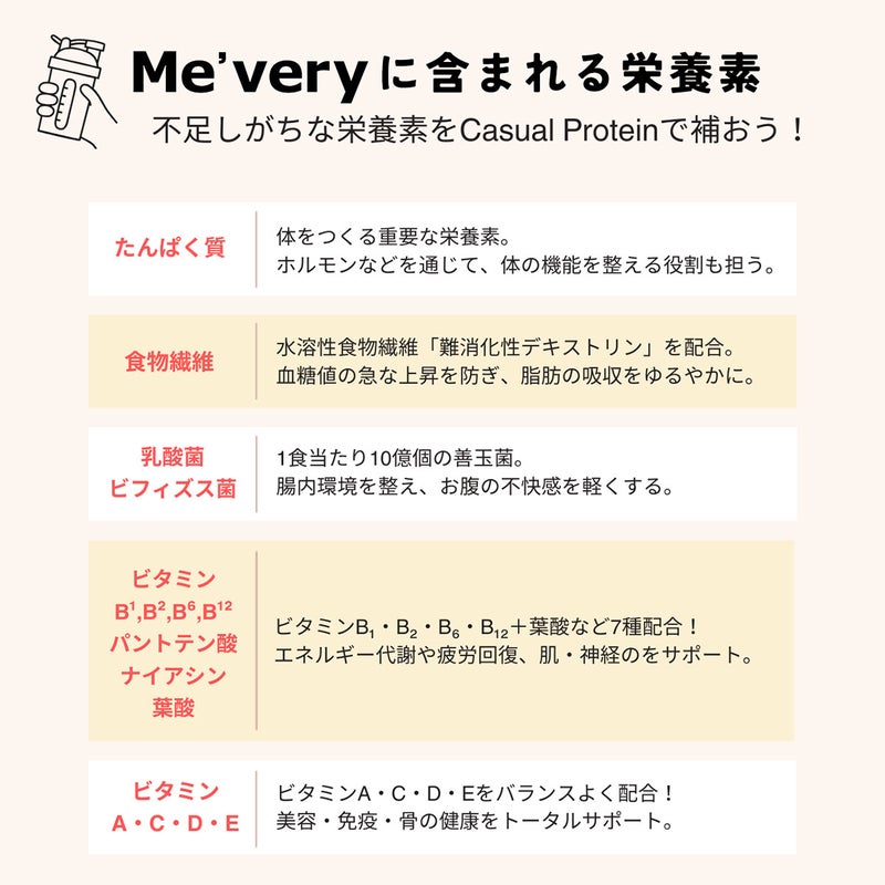たんぱく質以外にも、1日に欠かせない栄養成分がたっぷり入っています。