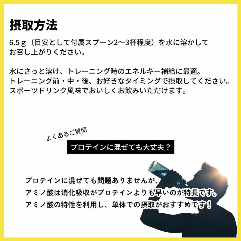 プロテインに混ぜても問題ありませんが、アミノ酸は消化吸収がプロテインよりも早いのが特長です。アミノ酸の特性を利用し、単体での摂取がおすすめです。