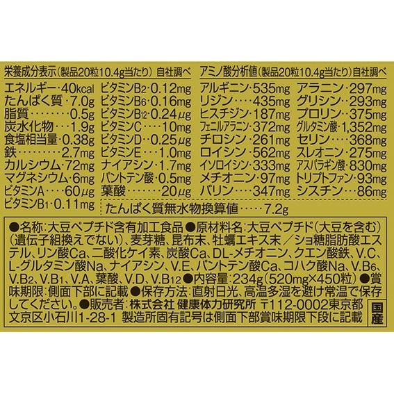 20粒あたり大豆ペプチドを7,000mg配合の本格派アミノ酸タブレット。アミノ酸スコア100、植物由来の大豆ペプチドで、体内で合成できない必須アミノ酸をバランス良く補給できます。さらにカラダづくりに必要なビタミン11種・ミネラル(カルシウム、鉄)をプラス!