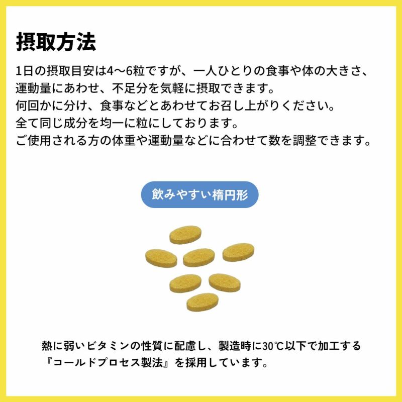 1日の摂取目安は4~6粒ですが、一人ひとりの食事や体の大きさ、運動量にあわせ、不足分を気軽に摂取できます。1日1粒でも2粒でも、同じ栄養素を凝縮してあるので大変便利です。
