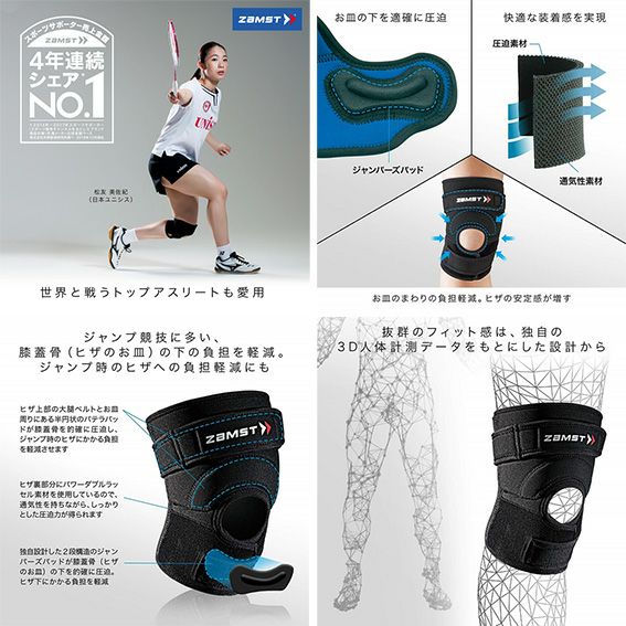 ジャンプ系競技のトラブルにジャンプ系統スポーツのヒザのトラブルに対応。独自のパッドで、ジャンプ時のヒザへの負荷を軽減します。