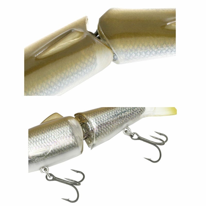 カバー回避能力に長けた「サイレントキラー」に、あらゆるフィールドに生息するベイトフィッシュサイズへとサイジングされリアルに作り込まれたフォルムにより、カバーに潜むフィッシュイーターに違和感なくバイトへといざなう115mmサイズのジョイントベイトです。ソフトシェルに包まれたボディはABS樹脂製中空コアボディが採用され、高浮力によるハイピッチでキレのあるクランキングアクションで、シャロークランクのような感覚でカバー攻略が可能。また瀕死のベイトフィッシュを演出するデッドスティッキングや表層引き、クリアアップ時にも効果的にバイトに持ち込むことができます。