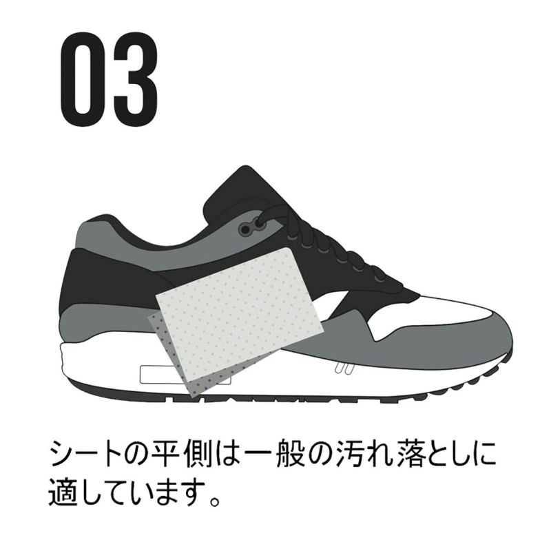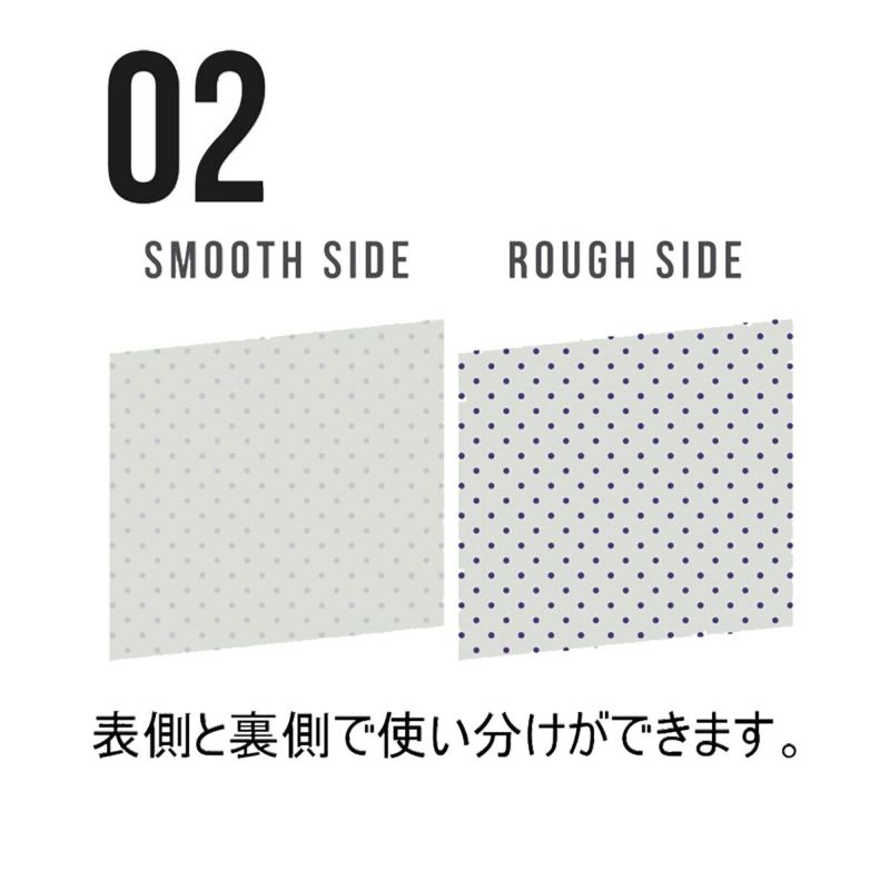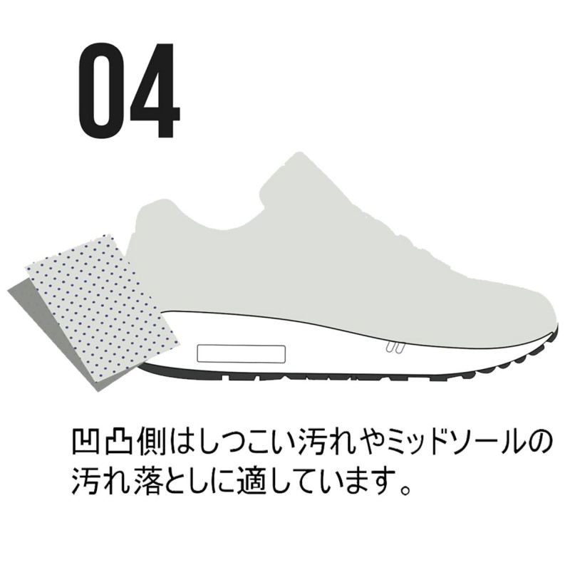 表裏で使い分けができ、なめらかな面は軽い汚れ落としや仕上げの拭き取りに適しています。凹凸面はしつこい汚れやミッドソールの汚れ落としに適しています。