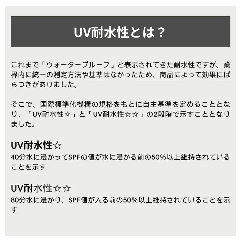 「UV耐水性★」は、40分水に浸かってSPFの値が水に浸かる前の50%以上維持されていることを示し、「UV耐水性★★」は、80分水に浸かり、SPF値が入る前の50%以上維持されていることを示します。