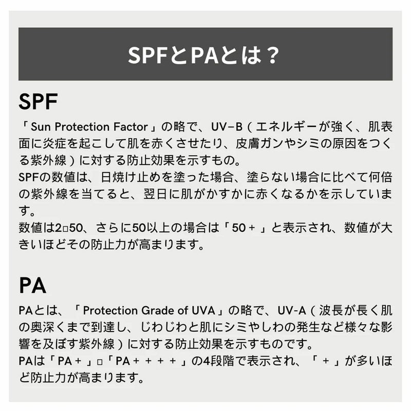 PAとは、「Protection Grade of UVA」の略で、UV-A(波長が長く肌の奥深くまで到達し、じわじわと肌にシミやしわの発生など様々な影響を及ぼす紫外線)に対する防止効果を示すものです。