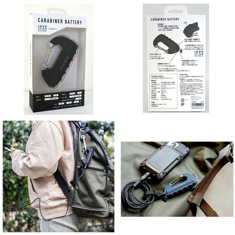 リュックの金具等に引っ掛けられるカラビナ型のバッテリー。防水性もあり、移動やアウトドアなど様々なシーンで活躍!