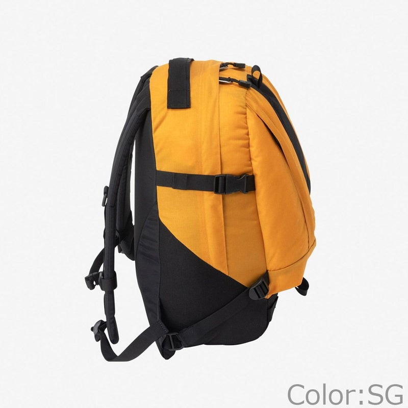 メイン素材に軽量性と耐久性に優れるRobicナイロンを採用し、ボトムには耐摩擦性が高い1000デニールのナイロン素材を配置。体のラインに合わせて設計した厚みのあるショルダーハーネスは、クッション性とフィット感が高くて快適な背負い心地です。荷物の量に合わせて、サイドコンプレッションで容量の調整が可能です。メインコンパートメント内にスリーブポケットを備え、フロントには傘やボトルの収納に便利なファスナー付き縦型ポケットを配置。フロントのセンターのデイジーチェーンには、カラビナなどで小物を連結できます。