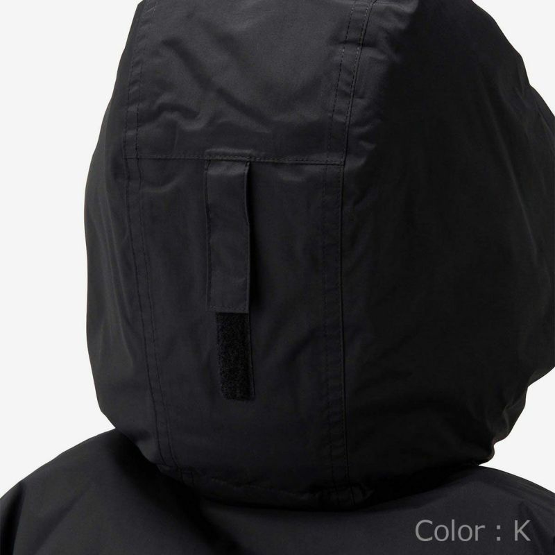 ヘルメット対応のフードは面ファスナーとドットボタンで着脱が可能で、通学などにも使いやすいデザインです。