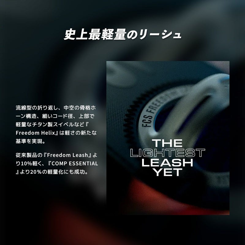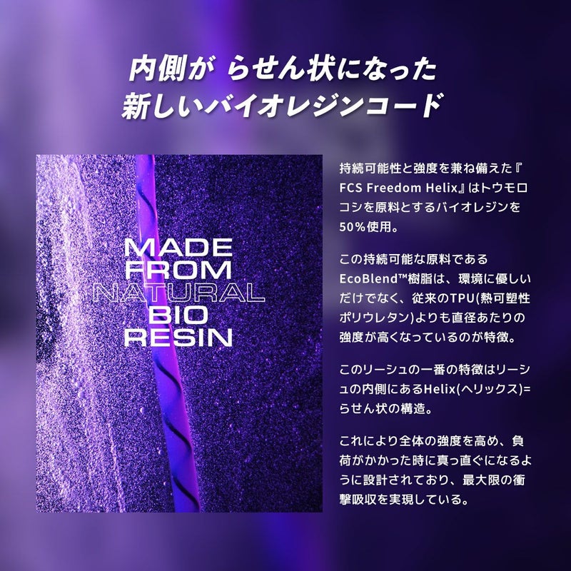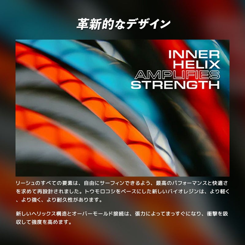 一番の特徴はリーシュの内側にあるHelix=らせん状の構造。これにより全体の強度を高め、負荷がかかった時に真っ直ぐになるように設計されており、最大限の衝撃吸収を実現。環境に優しいだけでなく、今まで経験したことのない軽さと速さでパフォーマンスレベルを向上させます。