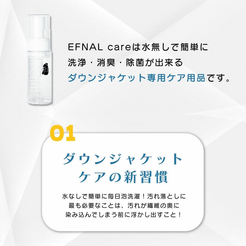 『EFNAL care(イフナルケア)』 は、今までできなかったアウターのメンテナンスケアがこれ一本で手軽に行えます。水を使わず洗浄・消臭・除菌が可能。