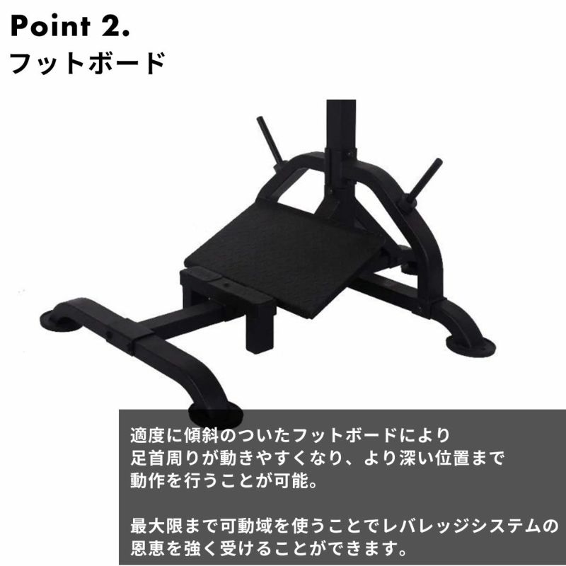 スクワットだけでなく、カーフレイズやランジといったバリエーション豊富なトレーニングを1台で可能にします。
