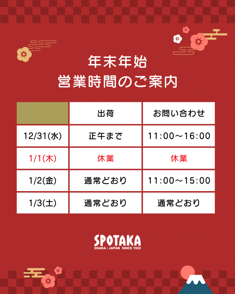 2025年12月31日(水)正午以降のご注文商品の発送は、休業日明けの1月2日(金)以降に、順次対応いたします。