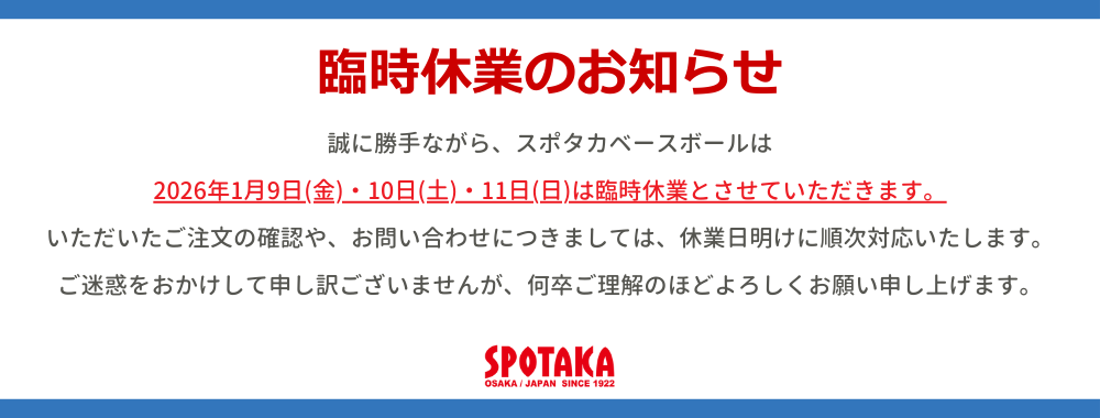 誠に勝手ながら、スポタカベースボール店は 2026年1月9日(金)・10日(土)・11日(日)は休業 とさせていただきます。 2026年1月8日(水)正午以降のご注文商品の発送は、休業日明けの1月12日(月)以降に、順次対応いたします。 ご不便をおかけいたしますが、何卒ご了承賜りますようお願い申し上げます。 ★ご注文は通常どおり承っております。 お問い合わせフォームへ